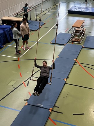 Am besten haben mir aber die beiden Stationen gefallen die jetzt kommen. Das war einmal eine Riesenschaukel und das Spinnenetz: Bei der Riesenschaukel wurde eine Holzstange von der Turnhallenwand runter gelassen. An der Station stand ein Turnkasten. Auf den musste man erst raufklettern und sich hinstellen, damit man genug Anschwung hatte um schaukeln zu können. Das Spinnennetz bestand aus einer Sprossenwand die man hochklettern musste dann auf der anderen Seite wieder runter um dann ein Taunetz hoch zu klettern . Dieses war mit einer Seite an der Sprossenwand befestigt und die andere Seite war an der Brüstung von der Turnhallenwand befestigt. Wenn man dieses Netz hochgeklettert ist, musste man noch über die Zuschauerbrüstung, um dann durch das Treppenhaus wieder in die Turnhalle zu gehen.