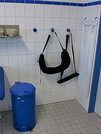 Hier kann man gut das Deckenliftsystem erkennen. Über der behindertengerechten Toilette befindet sich an der Wand ein sogenannter Notrufschalter, der auch auf dem WC sitzend, durch eine Schnurverlängerung, ausgelöst werden kann.